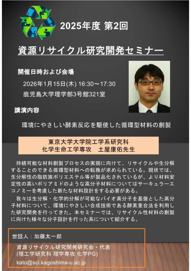 本センター研究会の一つに、「資源リサイクル研究開発研究会」がございます。その代表者である加藤太一郎 准教授(化学プログラム)が、以下の内容にて学術セミナーを開催いたします。有機化学的手法と酵素反応を駆使した循環型材料の創製研究に関する内容です。
